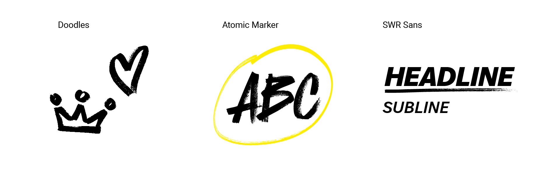 Ergänzt werden diese durch neue grafische Tools zur gezielten Schärfung des Designs. Diese Elemente im Handmade Style (Doodles, Brushes, Pfeile) und eine ergänzende Schrift Atomic Marker transportieren den Marken-Spirit (live, laut, lässig) und sichern eine authentische Präsenz.