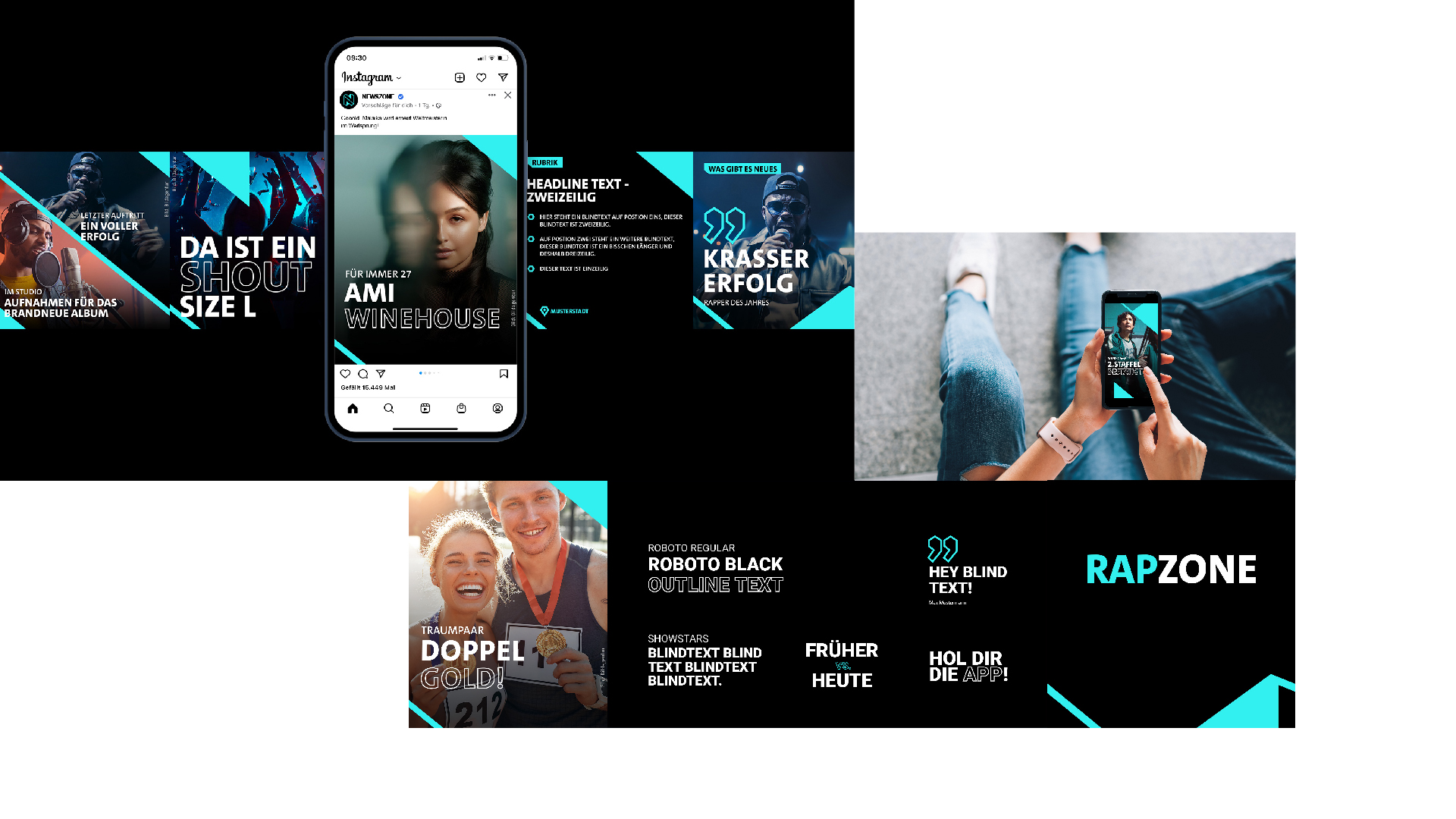 Urban-digital und aggressiv modern setzt das Design auf Asymmetrie, harte Kanten und starke Kontraste. Es visualisiert den pulsierenden Zeitgeist und schreit förmlich ‚Jetzt‘, ‚Live‘ und ‚Action‘.