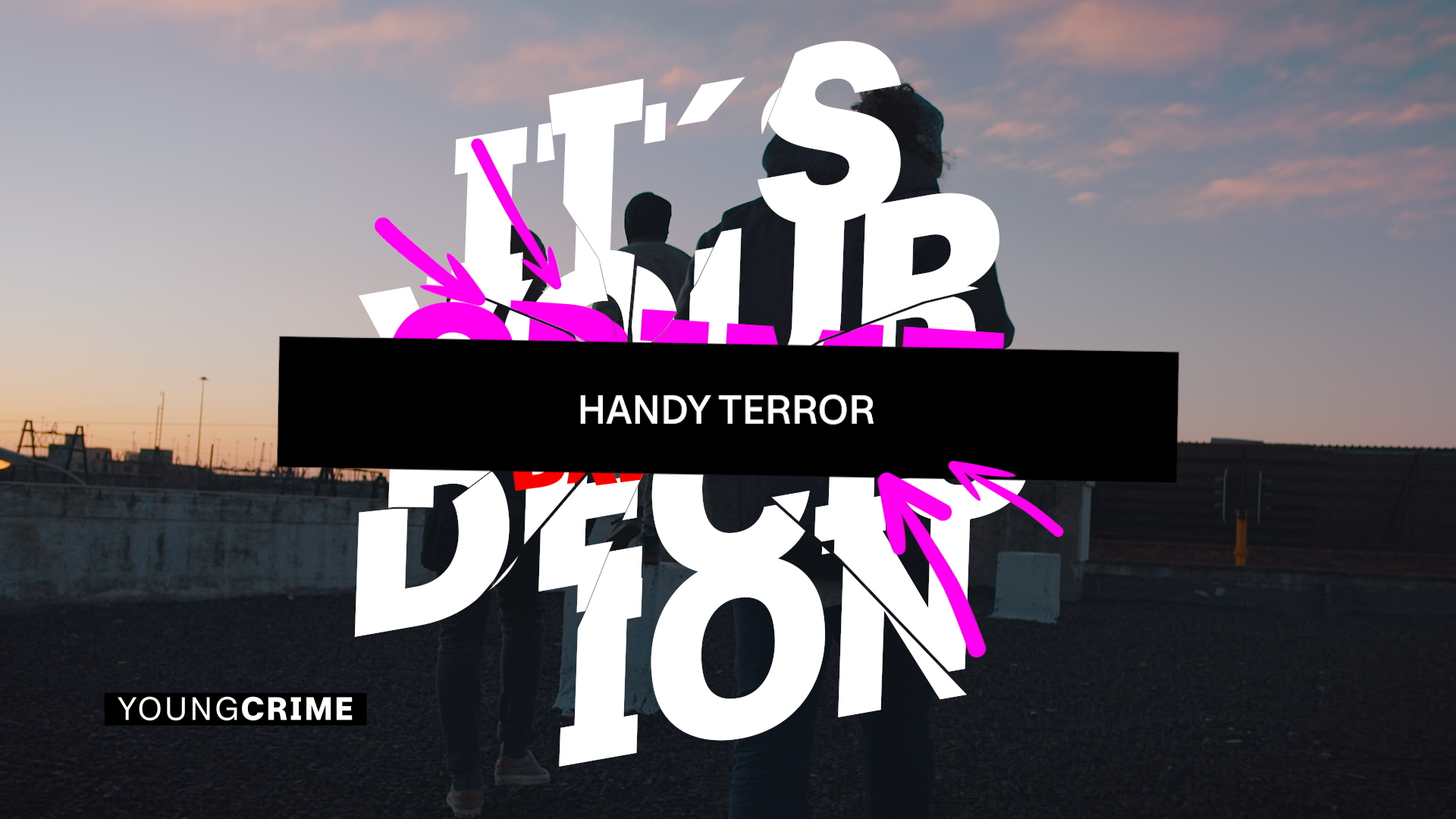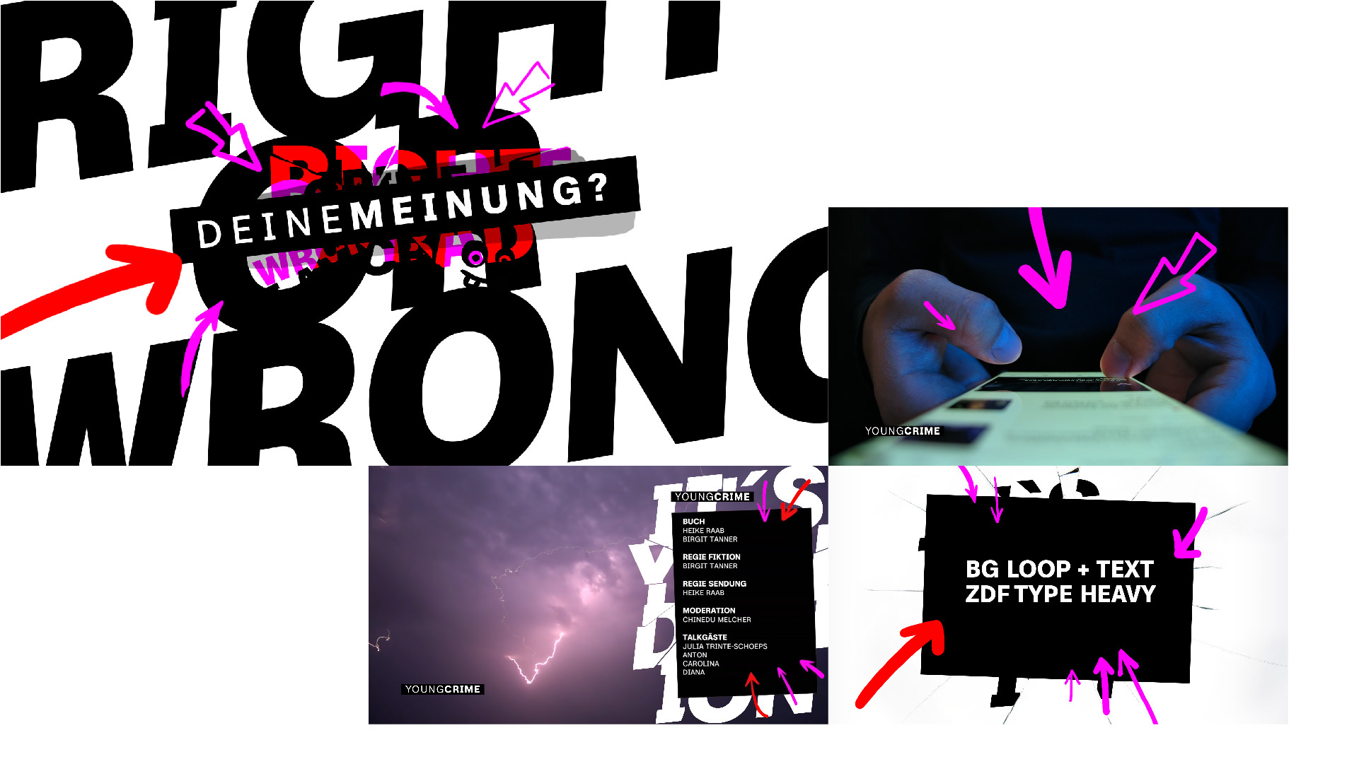 Radikale Sichtbarkeit für das neue ZDF-Format YOUNG CRIME. Ein Design, das nicht fragt, sondern schreit: Massive schwarze Typo, expressive Doodles, Smileys und knallige Akzente in Pink und Rot.